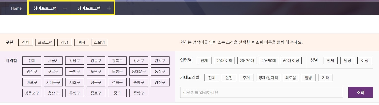 - 기본적으로 거주 지역(자치구)과 연령(20대 이하/20~30대/40~50대/60대 이상), 성별(남 /여), 카테고리(안전/ 주거/ 경제‧일자리/ 외로움/ 질병)를 지정해 맞춤형 정보로 찾을 수 있습다.