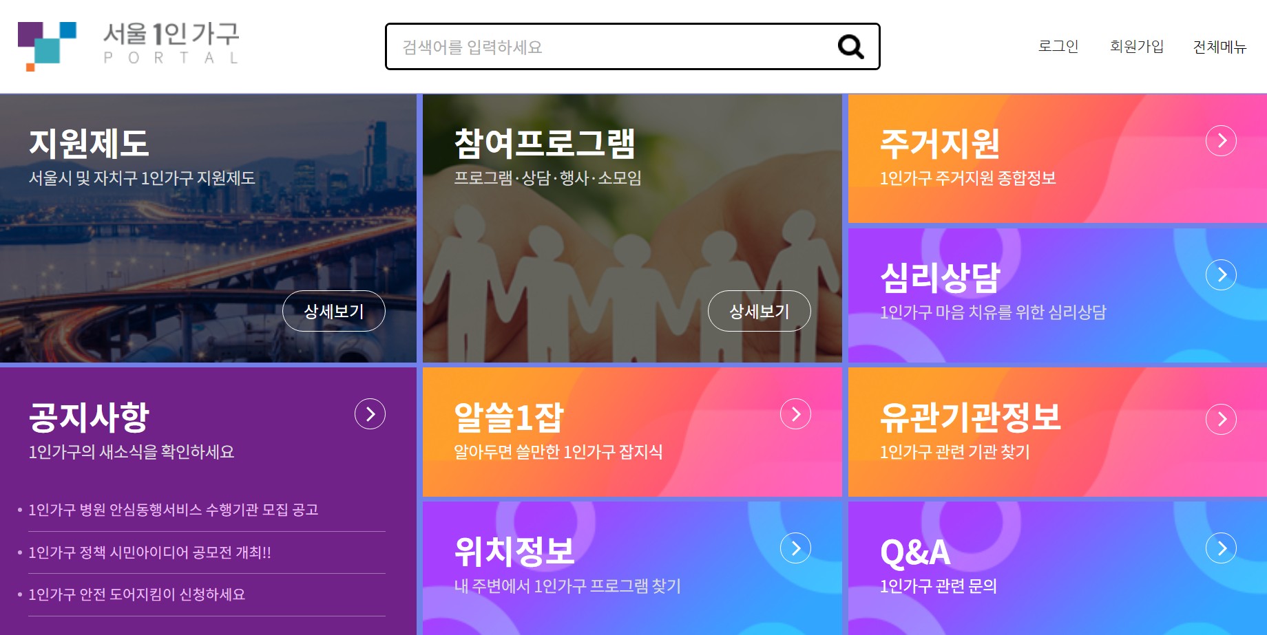 ‘서울 1인가구 포털’ 홈페이지는 9월 1일에 오픈했습니다. 서울시‧자치구가 1인가구를 위해 펼치고 있는 지원 정책과 참여 프로그램 등 1인가구에게 유용한 정보를 담아 1인 가구를 위한 정책‧정보를 한 눈에 볼 수 있습니다.