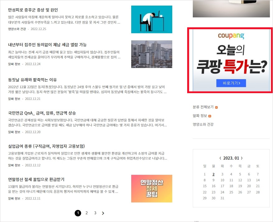 어떠신가요? 물론 사이드바의 위치는 본인이 원하는 곳에 배치가 가능합니다. 저는 네모난 배너를 만들어서 삽입했고 혹시나 아래처럼 간편한 '쿠팡 검색' 위젯으로도 넣을 수 있다는 점 참고 하시기 바랍니다.