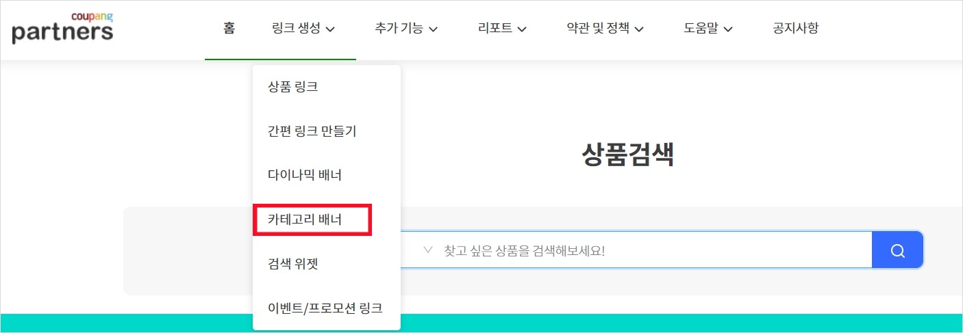 쿠팡파트너스 홈페이지에 들어가서 배너를 생성합니다. 저는 '카테고리' 배너로 설정해 보겠습니다.