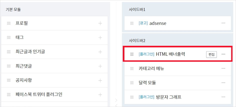 티스토리 관리자 화면에서 [사이드바]를 클릭하면 '기본모듈'에 플러그인 HTML 배너출력이라는 사이드바를 추가할 수 있습니다. 그러면 오른쪽에 사이드바 1, 2 중에 본인이 원하는 위치에 사이드바를 삽입할 수 있습니다.