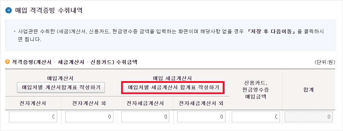 위에는 0원표시가 되어있지만 내 사업장에서 발행한 '계산서합계표 작성하기'를 클릭하시면 확인이 가능합니다. 계산서발행, 신용카드매출, 현금영수증 매출, 기타 매출로 세부사항을 입력하셔서 총합계가 일치하도록 입력합니다.
