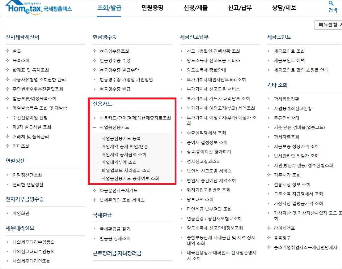 [조회/발급 → 신용카드 → 사업용신용카드 → 매입세액 공제금액 조회]
