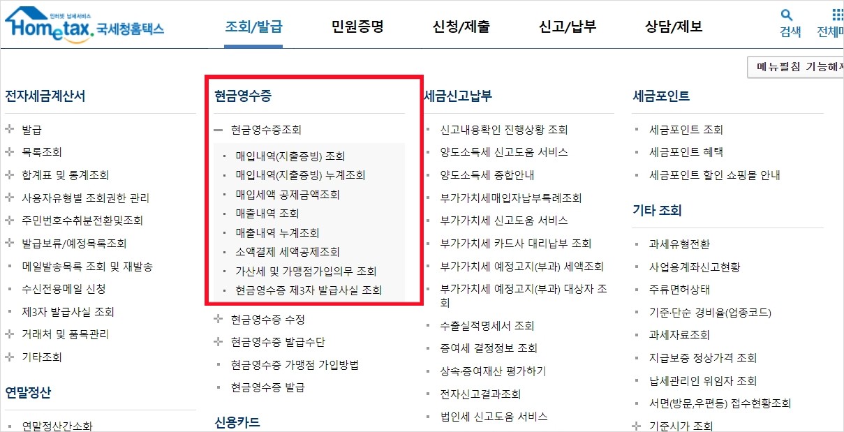 1. 현금영수증 매입내역 조회