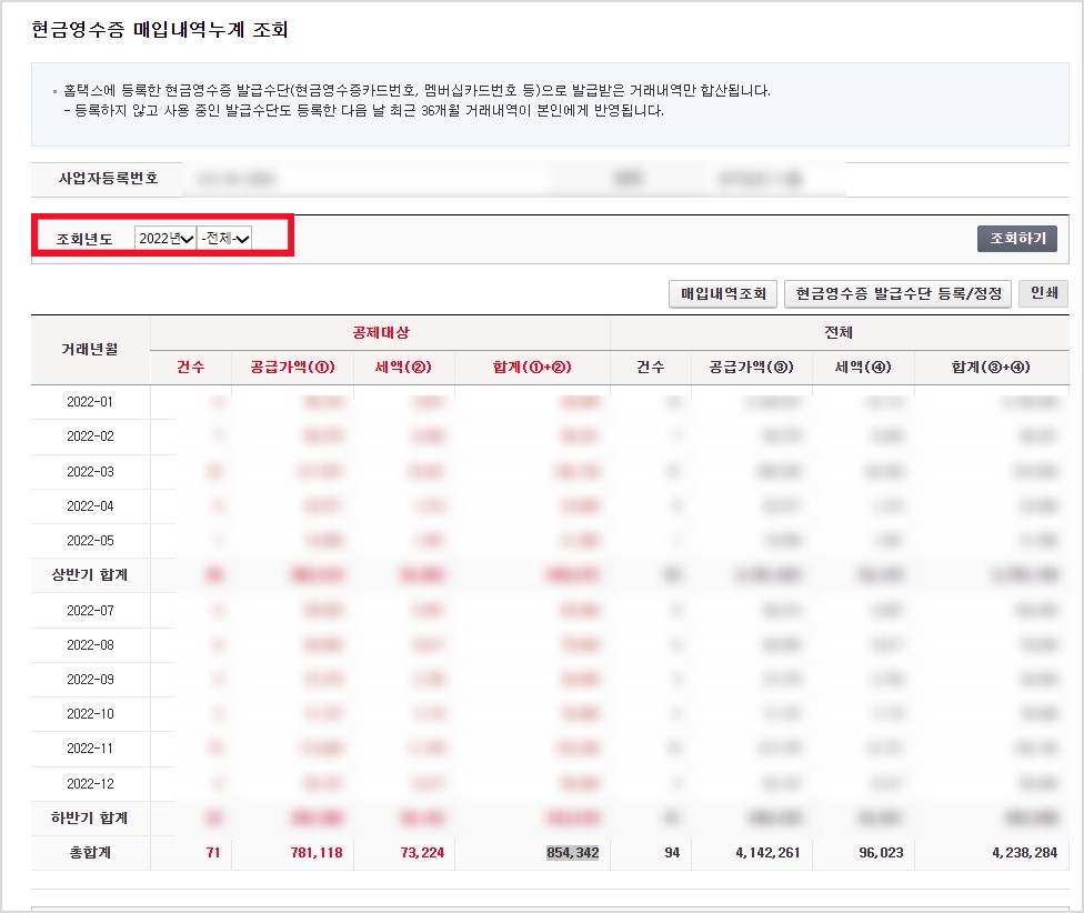 [조회/발급 → 현금영수증 → 현금영수증 매입내역 누계 조회]
