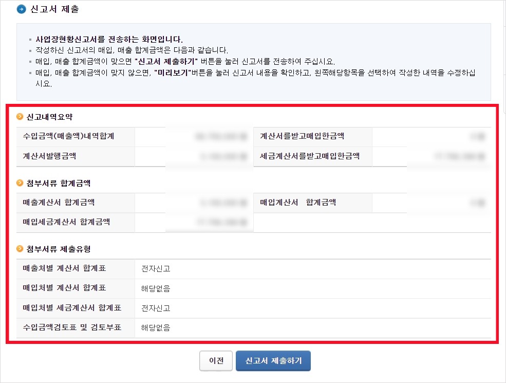 맨 마지막 화면에는 내가 입력한 매출, 매입 금액이 맞는지 확인할 수 있는 화면이 나옵니다. 신고내용 요약화면이니까 다시 한번 확인하시고 최종적으로 제출하시면 됩니다.