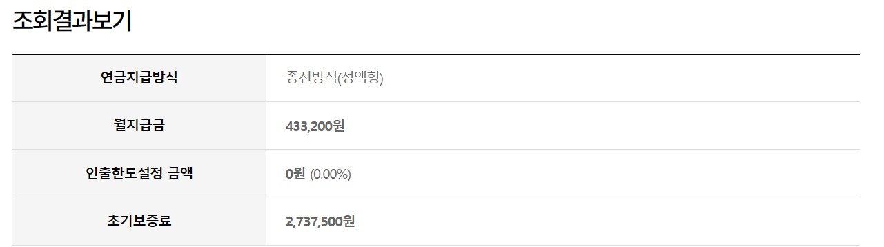 ※ 이 조회 결과는 조회시점 기준 예상금액이며, 실제 월지급금 및 인출한도 금액은 달라질 수 있습니다.